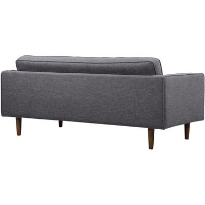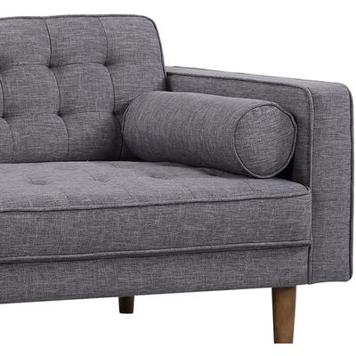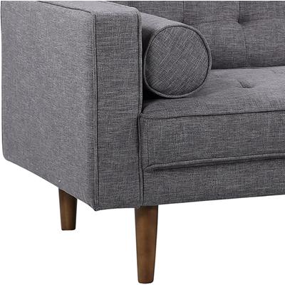 Our Excelsior Capulet modern loveseat takes on an abstract approach to a classic design. Its tufted bench seat draws inspiration from the mid-century age that truly never gets old. Upholstered in Dark Gray linen fabric that is soft to the touch and allows for ultimate seating comfort, and button tufted to perfection and finished with walnut wood legs that peek gracefully from underneath the seat. Its low arm rest allows for you to rest on with two matching bolster pillows on each end. Entertaining guests in your home is sure to lead to complement on your style.