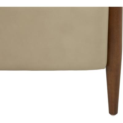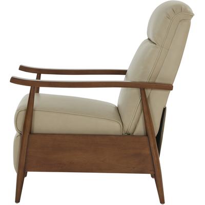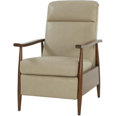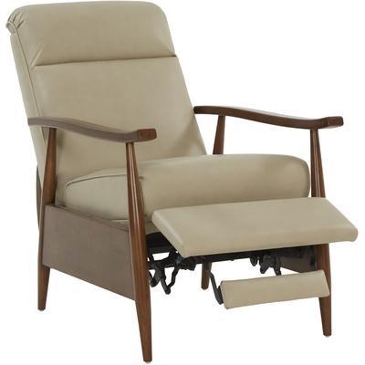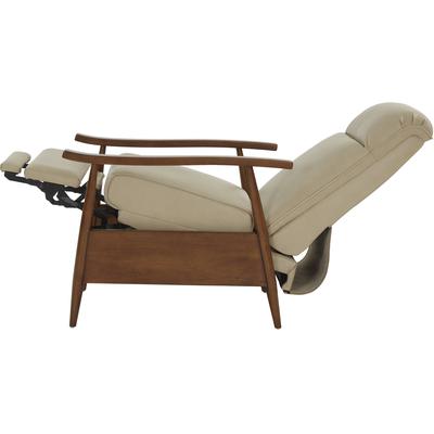 Mid-Century Modern, exposed wood frame push thru the arm 3-way recliner featuring a bull nose seat cushion with pocketed coil springs encased in foam and wrapped in Dacron, split 41.8" high pub back and Rustic Brown finish.